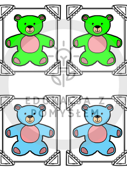 - 10 kart z elementami graficznymi w ramkach, odpowiednimi dla każdej z liczb (słowny zapis liczby, liczba oczek na kości do gry, liczba w odpowiedniej ilości patyczków, liczba w odpowiednim zbiorze przedmiotów- niedźwiedzi).